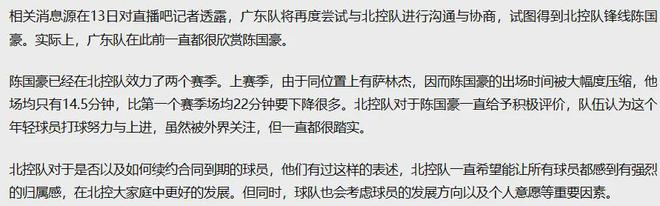 国内知名篮球平台报道:广东队再度尝试得到陈国豪。